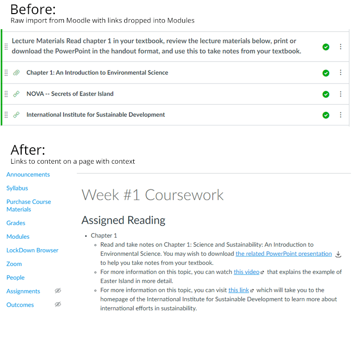 While it’s tempting to just drop links to PDFs, videos, and other resources directly into Modules, it’s much better to create Pages to hold those items. Pages let you add some context and instructions to the readings, and using Pages also keeps your Module List from getting too long and overwhelming.